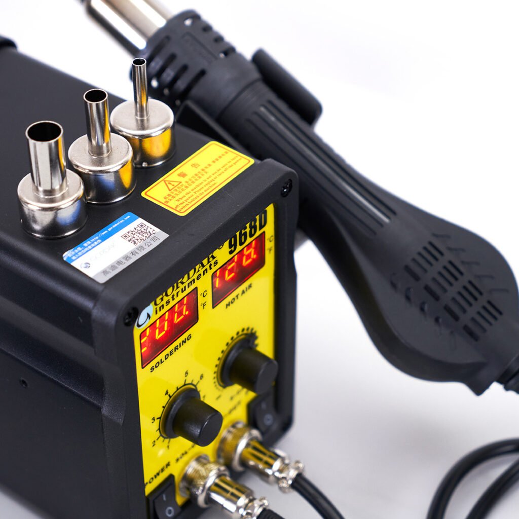 The GORDAK 968D is a high-performance 2-in-1 rework station combining hot air and soldering functions in a compact, ESD-safe design. Powered by a microcomputer closed-loop control system, it delivers fast heating, stable temperature accuracy, and powerful airflow for efficient SMD rework. Its brushless fan ensures smooth, uniform air delivery suitable for small and sensitive components. With intelligent sleep mode, auto-cooling protection, dual temperature display (°C/°F), fault self-diagnosis, and easy calibration, the 968D offers a reliable, user-friendly solution for professional electronics repair and production environments. The lightweight soldering iron handle and compact housing design make it ideal for long-term, space-efficient operation.