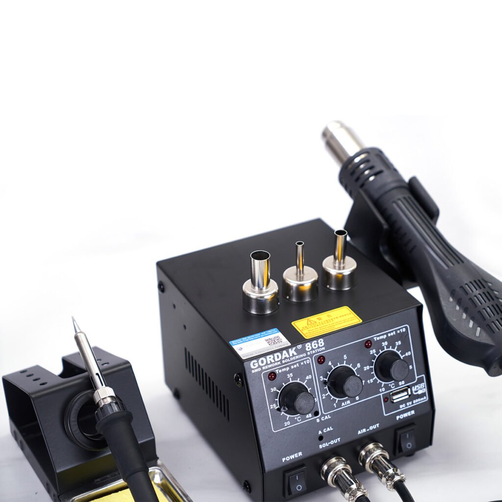 The GORDAK 868 2-in-1 Soldering Station is a professional-grade solution designed for precise electronic assembly, repair, and rework. Combining an anti-static hot air rework station and a high-quality soldering station, it delivers rapid heating, stable temperature control, and efficient airflow, making it ideal for both SMD and through-hole components.